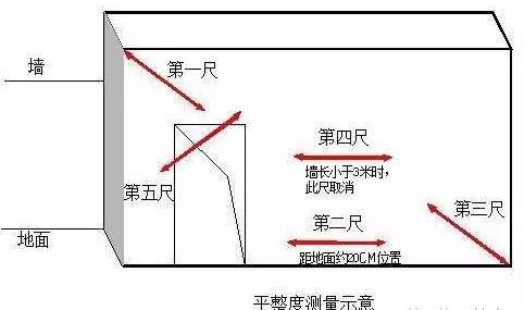 五、頂板水平度極差1、指標(biāo)說明:考慮實(shí)際測(cè)量的可操作性,選取同一功能房間混凝土頂板內(nèi)四個(gè)角點(diǎn)和一個(gè)中點(diǎn)距離同一水平基準(zhǔn)線之間5個(gè)實(shí)測(cè)值的極差值,綜合反映同一房間混凝土頂板的平整程度。2、測(cè)量工具:激光掃平儀、具有足夠剛度的5米鋼卷尺(或2米靠尺、激光測(cè)距儀)3、測(cè)量方法和數(shù)據(jù)記錄:(1)同一功能房間混凝土頂板作為1個(gè)實(shí)測(cè)區(qū),累計(jì)實(shí)測(cè)實(shí)量不得少于3個(gè)實(shí)測(cè)區(qū)。(2)使用激光掃平儀,在實(shí)測(cè)板跨內(nèi)打出一條水平基準(zhǔn)線。同一實(shí)測(cè)區(qū)距頂板天花線約30cm處位置選取4個(gè)角點(diǎn),以及板跨幾何中心位(若板單側(cè)跨度較大可在中心部位增加1個(gè)測(cè)點(diǎn)),分別測(cè)量混凝土頂板與水平基準(zhǔn)線之間的5個(gè)垂直距離。以最低點(diǎn)為基準(zhǔn)點(diǎn),計(jì)算另外四點(diǎn)與最低點(diǎn)之間的偏差。最大偏差值≤15mm時(shí),5個(gè)偏差值(基準(zhǔn)點(diǎn)偏差值以0計(jì))的實(shí)際值作為判斷該實(shí)測(cè)指標(biāo)合格率的5個(gè)計(jì)算點(diǎn)。最大偏差值﹥15mm時(shí),5個(gè)偏差值均按最大偏差值計(jì),作為判斷該實(shí)測(cè)指標(biāo)合格率的5個(gè)計(jì)算點(diǎn)。4、示例: