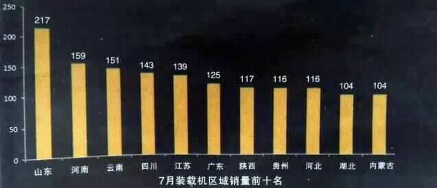 今年前7月,除2月份出口量不足800臺(tái),其它月份出口數(shù)量基本均在1000~1300臺(tái)的區(qū)間內(nèi)上下波動(dòng),相對(duì)比較平穩(wěn)。分區(qū)域來看,山東省繼續(xù)保持領(lǐng)先,7月份銷量達(dá)到217臺(tái),其余省份銷量均未達(dá)到200臺(tái),天津、上海、青海、海南、西藏等仍是銷量最少的省、市、自治區(qū)。