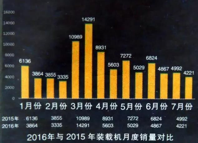 據(jù)公布的數(shù)據(jù),7月份全國26家主要裝載機(jī)生產(chǎn)企業(yè)共銷售各類裝載機(jī)4221臺(tái),同比2015年7月份的4992臺(tái),下降15.44%;環(huán)比6月份的4867臺(tái),下降13.27%。其中3噸及以上裝載機(jī)銷量為3796臺(tái),3噸以下小型裝載機(jī)銷量為425臺(tái)。從細(xì)分類型來看,3噸及5噸裝載機(jī)為主力銷售機(jī)型,合計(jì)銷量占比達(dá)到80%。綜合來看前7月銷量,除3月份曇花一現(xiàn)般同比大幅增長30.05%外,其余月份裝載機(jī)銷量均在下滑。但一個(gè)積極的現(xiàn)象是,4月份以來裝載機(jī)雖持續(xù)下滑,但降幅一直在收窄,自4月份的37.26%收窄到7月份的15.44%。