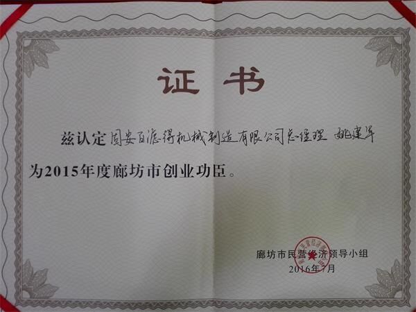 近日,固安百濾得機(jī)械制造有限公司總經(jīng)理姚建軍榮獲廊坊市創(chuàng)業(yè)功臣獎,獎金十萬元整,也正是如此,更加說明市場對百濾得的認(rèn)可,百濾得對市場的優(yōu)質(zhì)服務(wù)。