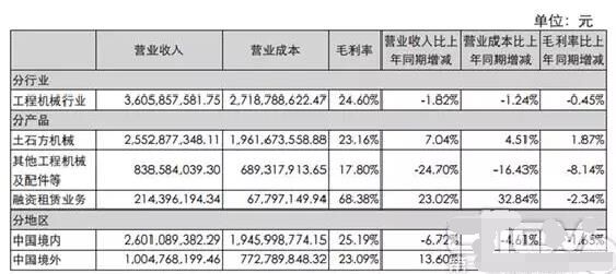 三一重工2016年半年度報告數據(部分) |