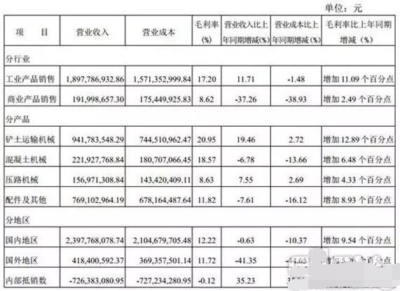 徐工2016年半年度報告數據(部分) |