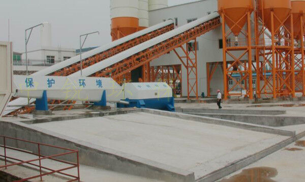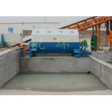 該系統(tǒng)主要由:攪拌車加水清洗裝置,溜槽輸送裝置,砂石漿水分離裝置,和泥漿水后處理裝置組成?;炷凛斔驮O(shè)備清洗后,將殘余混凝土排入溜槽中,在高壓水流沖擊下,經(jīng)溜槽進(jìn)入砂石分離機(jī),在不斷旋轉(zhuǎn)的分離機(jī)作用下,對混凝土進(jìn)行充分的清洗,同時(shí)將砂、石進(jìn)行分離,分離后的砂、石在導(dǎo)料葉片的作用下背向流動,再通過提升式出料口排出分離機(jī),分別堆放。清洗后的漿水從分離機(jī)的底部排出進(jìn)入沉淀池逐級沉淀后循環(huán)使用或進(jìn)入攪拌池回收利用。進(jìn)入攪拌池(一般情況2個(gè)攪拌池)的漿水為了防止沉淀凝固,需通過攪拌器的作用,攪拌器的工作為間歇式。分離出水泥漿在連續(xù)的攪拌器作用下,再通過高壓污水泵輸送到攪拌樓中待生產(chǎn)計(jì)量再利用。整個(gè)控制系統(tǒng)設(shè)有手動和自動控制,方便控制設(shè)置,整個(gè)系統(tǒng)運(yùn)行可靠,故障率低,維護(hù)量少等特點(diǎn)。