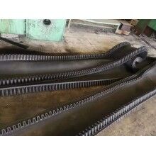 大傾角擋邊輸送帶的基帶是由上覆蓋膠、下覆蓋膠、帶芯和橫向剛性層四部分組成。上覆蓋膠厚度一般為3-6mm;下覆蓋膠厚度一般為1.5-4.5mm,帶芯材料承受拉力,其材料可以是棉帆布(CC)、尼龍帆布(NN)、聚酯帆布(EP)或鋼繩芯(ST)。為了增加基帶的橫行剛性,在芯體上下添加特殊加強層,稱橫向剛性層?;鶐У膶挾纫?guī)格,與普通膠帶相同,符合GB7984-2001的標(biāo)準(zhǔn)規(guī)定。