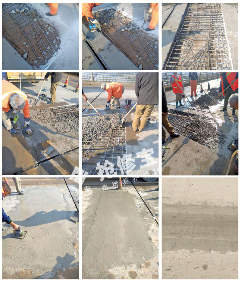 快速修補(bǔ)橋面公路的施工流程:修補(bǔ)基面處理——計(jì)算材料用量——材料攪拌振搗 抹面壓光——灑水養(yǎng)生——達(dá)到設(shè)計(jì)強(qiáng)度70%時(shí)開(kāi)放交通