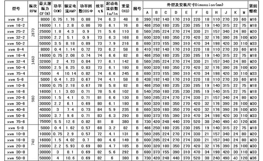 1)XVM振動電機 此型號振動電機系采用先進技術設計生產的振動電機。 XVM振動電機2)先進的設計技術:所有參數(shù)的計算及其優(yōu)化設計均由計算機工作站全面完成。精密的加工工藝、嚴格的質量體系,保證了振動電機工作狀態(tài)下各部件配合、承力在最佳范圍內。 3)特殊的電磁設計:振動電機所需要配置的定、轉子均采用具有優(yōu)質導磁性能的硅鋼片,減少鐵芯的渦流損耗,保證強大的起動力矩,可快速達到額定運轉速度。 4)重載型軸承設計:所采用軸承均為重載型特制軸承,足以承受和傳遞徑向激振力和軸向負荷,并有良好的散熱能力。雙重密封設計,保證在嚴重粉塵環(huán)境下的軸承室清潔。選用進口耐高溫軸承鋰基脂潤滑油,延長軸承使用壽命。 5)無極調節(jié):振動電機兩端的激振塊上標有精確的刻度盤,可以非常容易的調節(jié)激振力及工作力矩從零到最大的無極調節(jié),滿足工作需要。 6)。XVM振動電機的設計可適用于各種標準電壓及頻率的三相交流電源,如適用于中國、歐洲的220/380V、50HZ電壓等級;美國的230/460V、60HZ電壓等級;日本的220V、50/60HZ電壓等級等,能應用于世界各地。還可適用各種電氣制動方式,如能耗制動、反接制動等。