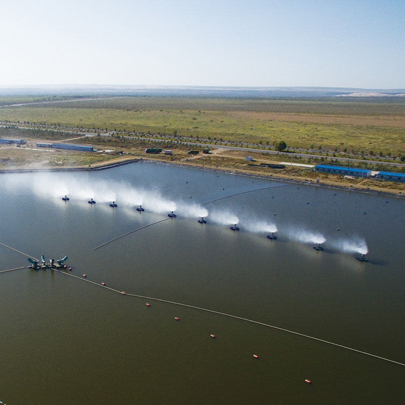 通過(guò)高速旋轉(zhuǎn)葉輪將水破碎至100微米粒徑小液滴,形成水霧,利用自然天氣條件進(jìn)行蒸發(fā)。強(qiáng)制蒸發(fā)的作用:可增強(qiáng)蒸發(fā)效果14~30倍,蒸發(fā)同樣的廢水所需蒸發(fā)塘面積可降低到原來(lái)的1/10。