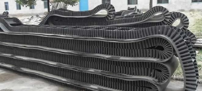 大傾角波狀擋邊帶由基帶、擋邊、橫隔板3部分組成。擋邊起防止物料測滑撒落的作用。為便于繞過滾筒,檔邊設(shè)計成波紋狀;橫隔板的作用是承托物料,為了實現(xiàn)大傾角輸送,采用TTC型。檔邊和橫隔板是用二次硫化的方法與基帶連接的,具有很高的連接強度。