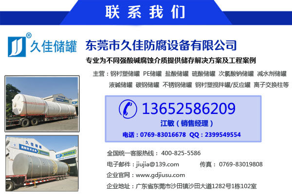 生產(chǎn):減水劑pe儲罐、外加劑pe儲罐、久塑牌(1-125m3)立/臥式鋼襯塑(PE/PO)/碳鋼/不銹鋼儲罐、(5-50m3)管口一體成型PE儲罐、鋼襯塑攪拌罐/反應(yīng)罐/過濾罐/中和罐、離子交換柱、鹽酸儲罐、硫酸儲罐、次氯酸鈉儲罐、液堿儲罐、硝酸儲罐、減水劑儲罐、化工儲罐、酸堿儲罐等防腐儲存容器設(shè)備;公司規(guī)模和產(chǎn)品質(zhì)量在國內(nèi)處于領(lǐng)先地位。
