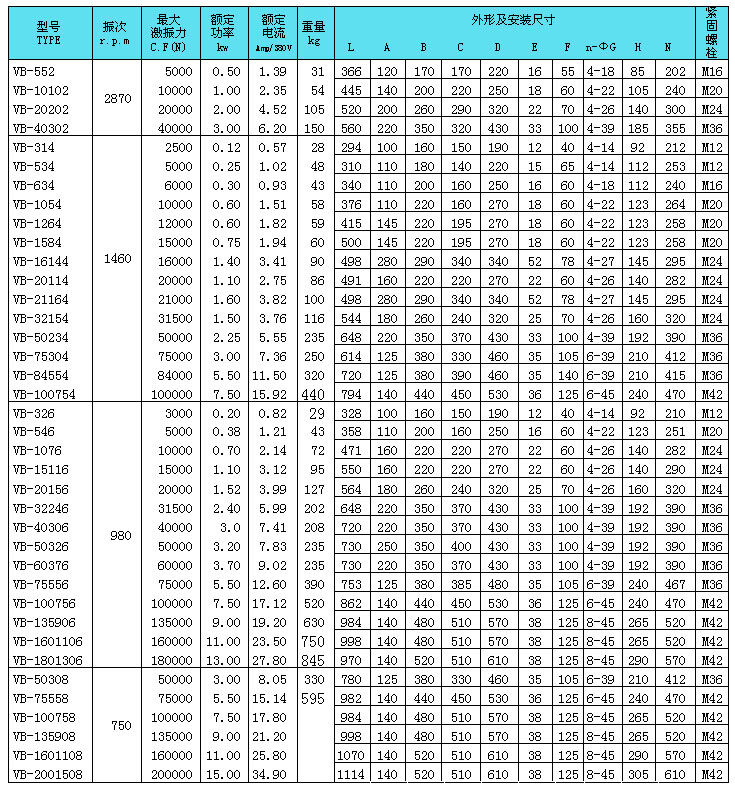 VB-1584-W振動電機外形安裝尺寸技術參數表
