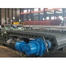 通過分析研究上述問題,結(jié)合國(guó)內(nèi)外給料機(jī)使用情況,重新設(shè)計(jì)制作了一臺(tái)新型給料機(jī),主要特點(diǎn)是:采用板式給料機(jī)連續(xù)給料;板式給料機(jī)料板采用雙圓弧、節(jié)點(diǎn)重合的方式,解決了漏料問題;板式給料機(jī)安裝角度為18°,可使物料緩慢分散跌落到皮帶機(jī)上;撥料棍采用逆物料方向旋轉(zhuǎn),以控制物料層的厚度;料斗設(shè)計(jì)采用漸開式,解決了膨料問題;電機(jī)采用變頻控制,可控制出料速度。經(jīng)過三個(gè)多月的的現(xiàn)場(chǎng)使用,證明能夠完成勻料,效果較好。