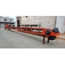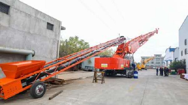 我公司生產(chǎn)的可移動式混凝土運輸、澆筑設(shè)備——自行帶式混凝土布料機,小時澆筑強度可達270m3。為了解決混凝土布料機的供料問題,自行研制了可移動式上料平臺。