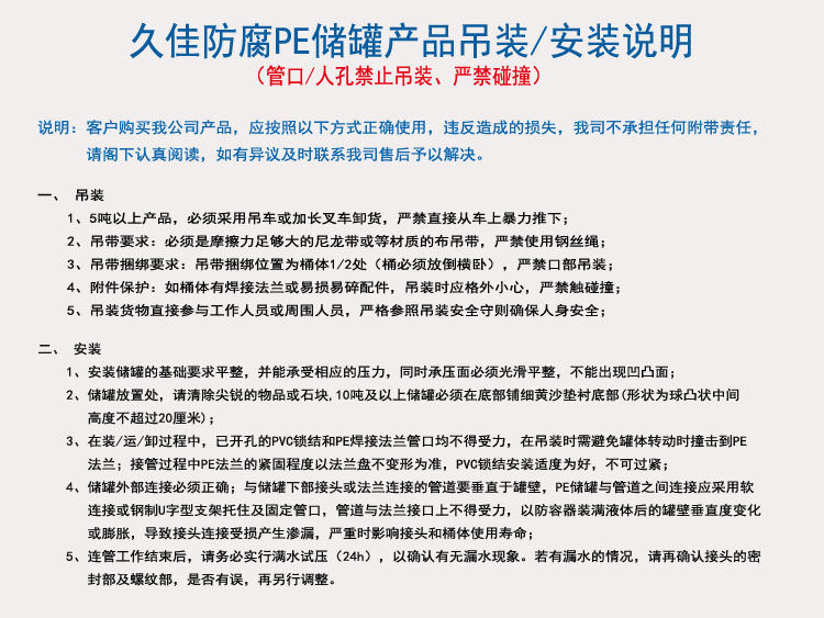 2)公司多年研發(fā),結合國內外先進的滾塑產品生產配方,研發(fā)出專屬久佳防腐環(huán)保型pe儲罐生產配方,能夠大大提升產品的質量與性能,所用輔料也是綠色衛(wèi)生安全無污染的輔料,質量有保障;