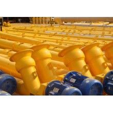 水泥等粉料的輸送必須在完全密封的腔體內(nèi)進(jìn)行,以免污染環(huán)境和輸送物料受潮。O形截面的螺旋輸送機(jī)是應(yīng)用最廣泛的粉料供料輸送裝置。其機(jī)殼采用無(wú)縫鋼管,常見(jiàn)規(guī)格有φ219,φ273,φ325,機(jī)殼尾部進(jìn)口通過(guò)球形絞鏈與筒倉(cāng)翻板門(mén)連接,頭部出口通過(guò)帆布袋柔軟連接通向主體上的粉料秤斗。安裝傾角一般在30°45°之間,必要時(shí)可達(dá)60°。螺旋的長(zhǎng)度不應(yīng)超過(guò)14m,可通過(guò)更換中間節(jié)段得到不同的螺旋總長(zhǎng)度。