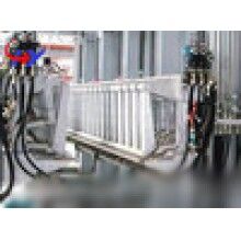 靜停養(yǎng)護達到切割強度后,模框由翻轉(zhuǎn)行車吊運至切割機工位上,翻轉(zhuǎn)吊具將??蚍D(zhuǎn)90°放在切割小車支座上,然后由翻轉(zhuǎn)吊具機械手自動開啟???、脫模,把坯體連同側(cè)板側(cè)立在第一輛切割小車上,脫下的??蚯謇砗笈c蒸養(yǎng)返回的經(jīng)清理噴油后的側(cè)板組合成模具,等待澆注。在組模的同時,脫模后的坯體在切割機上分部做定點切割,首先第一輛切割小車帶動坯體行走經(jīng)過縱切裝置進行縱向切割,坯體在進行縱向切割時,分別由切割刀片和由汽缸張緊的切割鋼絲同時完成側(cè)面、面包頭及頂面廢料的切割與清理,縱切結(jié)束后,切割小車繼續(xù)行走至橫切裝置中央位置停止,橫切架自上而下垂直降落進行坯體的橫向切割,橫切時切割鋼絲作鋸裝擺動,完成坯體的鋸裝橫向切割。坯體切割完成后,人工推鏟出去頂部面包頭。小車置換裝置啟動,由切割機下方小車置換油缸將切割好的坯體連同側(cè)板頂起,下方第一輛小車返回起始位置,去承載新的帶切割的坯體,第二輛小車替換第一輛小車位置,并承載坯體及側(cè)板行走至預(yù)定位置,最后坯體由半成品吊車連同地板吊運至釜前蒸養(yǎng)小車上,在軌道上進行編組。