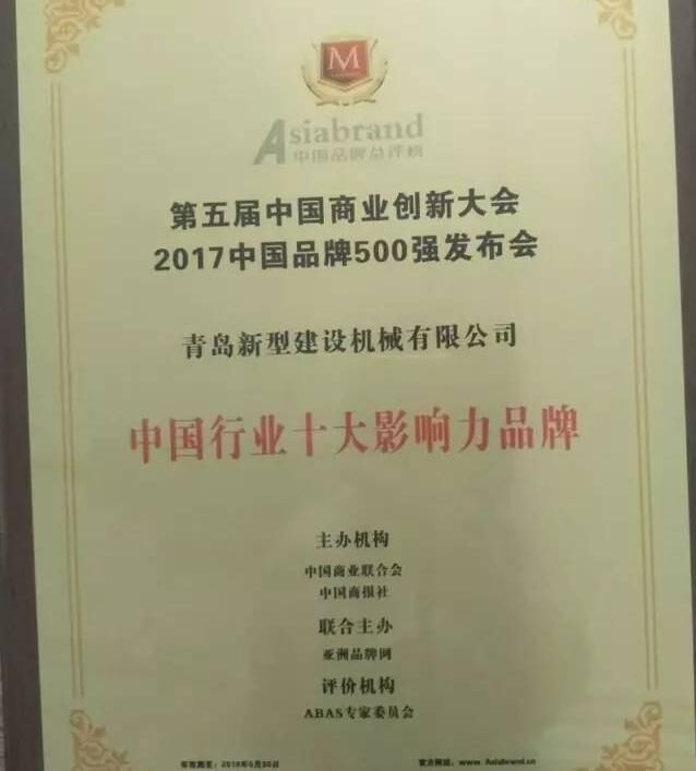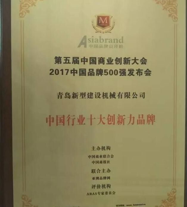 2017年5月31日,以“新品牌、新供給、新未來”為主題的第五屆中國商業(yè)創(chuàng)新大會暨2017中國品牌500強發(fā)布會在北京國家會議中心隆重舉行。建筑機械行業(yè)知名企業(yè)中青林集團旗下青島新型建設機械有限公司受邀參會,一舉榮獲“中國行業(yè)十大創(chuàng)新力品牌”與“中國行業(yè)十大影響力品牌”。