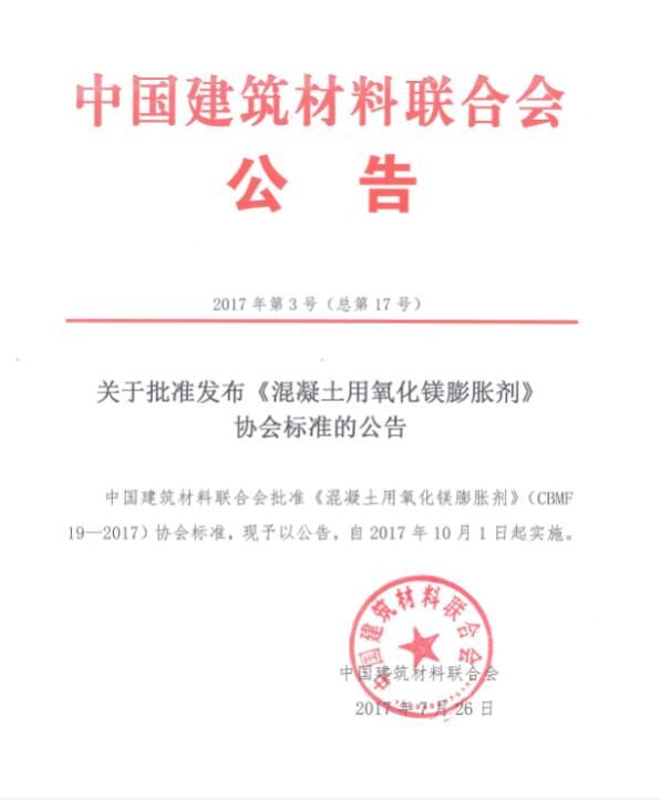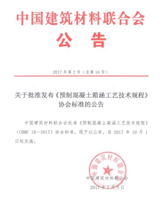 2017年7月,由中國(guó)混凝土與水泥制品協(xié)會(huì)(以下簡(jiǎn)稱協(xié)會(huì))組織制定的《預(yù)制混凝土箱涵工藝技術(shù)規(guī)程》和《混凝土用氧化鎂膨脹劑》兩項(xiàng)協(xié)會(huì)標(biāo)準(zhǔn),通過審定并發(fā)布批準(zhǔn)公告,標(biāo)準(zhǔn)號(hào)分別為CBMF 18-2017和CBMF 19-2017,將同時(shí)于2017年10月1日起實(shí)施。這是國(guó)務(wù)院《深化標(biāo)準(zhǔn)化工作改革方案》(國(guó)發(fā)[2015]13號(hào))及質(zhì)檢總局、國(guó)家標(biāo)準(zhǔn)委《關(guān)于培育和發(fā)展團(tuán)體標(biāo)準(zhǔn)的指導(dǎo)意見》(國(guó)質(zhì)檢標(biāo)聯(lián)[2016]109號(hào))發(fā)布后,協(xié)會(huì)與中國(guó)建筑材料聯(lián)合會(huì)(以下簡(jiǎn)稱聯(lián)合會(huì))聯(lián)合發(fā)布的首批協(xié)會(huì)標(biāo)準(zhǔn),兩項(xiàng)標(biāo)準(zhǔn)將公開出版并發(fā)行。