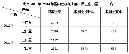 截止到2014年底,中國(guó)工程機(jī)械主要產(chǎn)品保有量約為650萬(wàn)-704萬(wàn)臺(tái)。其中,混凝土攪拌運(yùn)輸車(chē)29.2萬(wàn)-31.6萬(wàn)臺(tái),混凝土泵車(chē)5.9-6.3萬(wàn)臺(tái),混凝土泵6.3萬(wàn)-6.8萬(wàn)臺(tái),混凝土攪拌站4.7萬(wàn)-5.2萬(wàn)臺(tái)。