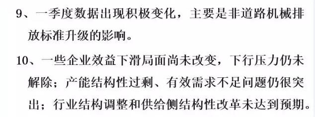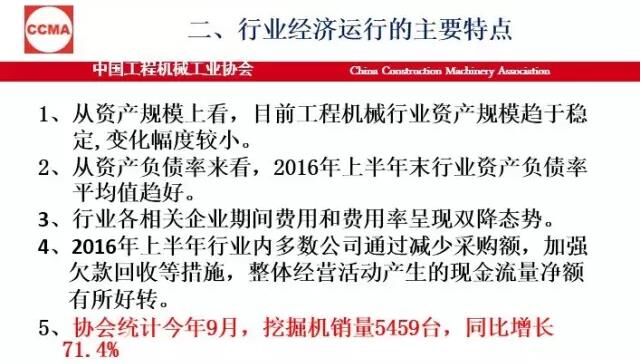 我個(gè)人總結(jié),今年的運(yùn)行情況有這樣十個(gè)方面。第一,從整個(gè)全行業(yè)各企業(yè)的資產(chǎn)規(guī)模上看,目前趨于穩(wěn)定,變化幅度很小,不像前兩年振動(dòng)那么大。第二,從資產(chǎn)負(fù)債率來說,現(xiàn)在負(fù)債率是在60%左右,全國(guó)的工業(yè)企業(yè)是56%。所以,這個(gè)行業(yè)的資產(chǎn)負(fù)債率目前看也是很好的。這個(gè)需要引起大家的關(guān)注和分析,我們也希望后幾個(gè)月情況可以穩(wěn)定向好。還有自主品牌市場(chǎng)占有率,在國(guó)內(nèi)市場(chǎng)還是保持高位,從全行業(yè)來看在90%以上。那么,產(chǎn)業(yè)的集中度又進(jìn)一步地增強(qiáng)了,但有一些企業(yè)挺無助的,出局了,進(jìn)口額下降。今年按照環(huán)保部5號(hào)令,全行業(yè)工程機(jī)械產(chǎn)品實(shí)現(xiàn)了新的標(biāo)準(zhǔn)升級(jí)。整個(gè)產(chǎn)品進(jìn)行了更新?lián)Q代,這個(gè)非常難能可貴。最后是產(chǎn)能結(jié)構(gòu)性過剩,有效需求不足問題仍然突出,行業(yè)結(jié)構(gòu)調(diào)整還有供給側(cè)結(jié)構(gòu)改革遠(yuǎn)遠(yuǎn)沒有達(dá)到預(yù)期。即便是按照現(xiàn)在的挖掘機(jī)銷量5500多臺(tái),就算是6000臺(tái),產(chǎn)能又有多少?一旦市場(chǎng)回暖,一些企業(yè)家還是會(huì)頭腦一熱,這樣大一個(gè)產(chǎn)能釋放出來的產(chǎn)量是什么局面?我們必須保持一個(gè)清醒的頭腦。
